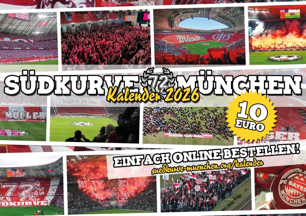 Den Kalender könnt ihr wie immer für 10€ pro Stück + pauschal 7,50€ Versandkosten unter https://suedkurve-muenchen.org/kalender bestellen. Um uns die Arbeit zu erleichtern und euch Porto zu sparen wären wir dankbar, wenn ihr euch zu Sammelbestellungen zusammenschließt. Der Versand erfolgt voraussichtlich Anfang KW51, also solltet ihr das Paket vor Weihnachten im Briefkasten haben.
