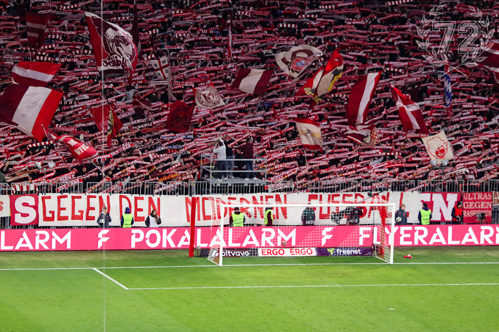 Die Aktion hatte diesmal primär den Zweck, uns nicht der von der UEFA gegen den FC Bayern verhängten Bewährungsstrafe zu beugen, auch wenn dafür Konsequenzen drohen. Wir wussten und wissen, dass diese Konsequenzen viele Bayernfans treffen, die keine Verantwortung für unsere Aktion tragen und vielleicht sogar eine andere Meinung dazu haben. Gerade das ist ja auch das Perfide an diesem Werkzeug, das zurecht in demokratischen Rechtssystemen keinen Platz hat, aber leider in der Sportgerichtsbarkeit der UEFA inflationär Anwendung findet. Leider hat dieser Verband auch eine Struktur, die unserem Anliegen keine andere Stimme gibt als eben durch Aktionen im Stadion.
